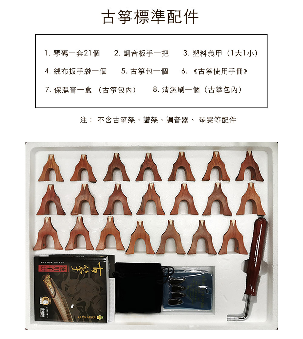 配備﹕ 琴袋、調音匙及袋、清潔掃、古箏使用手冊、箏碼、指甲、保濕膏