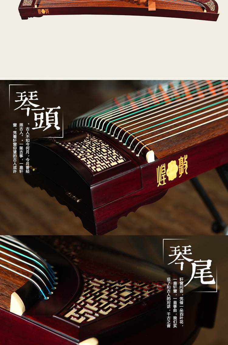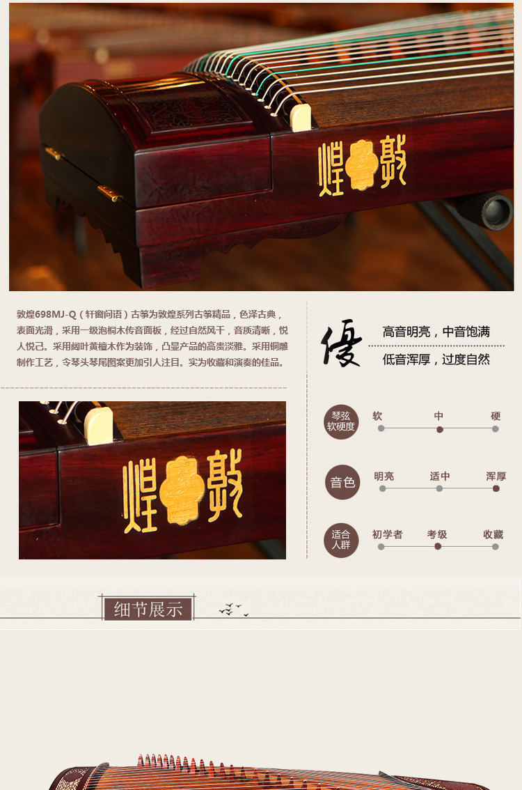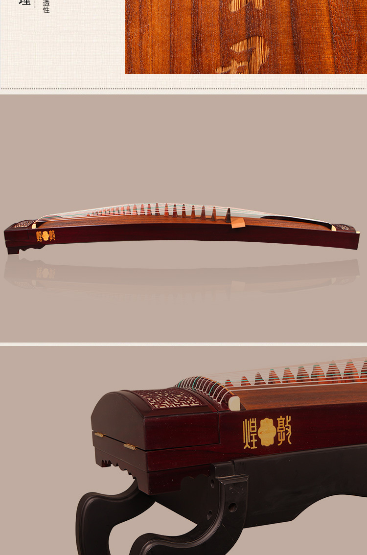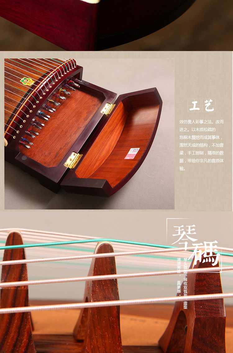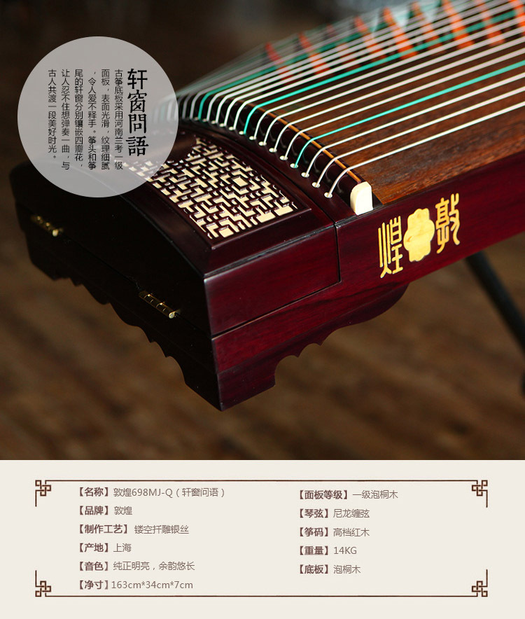 規格﹕ 163cm、21弦、特選闊葉黃檀、泡桐木(面板及底板)、高檔紅木(箏碼)