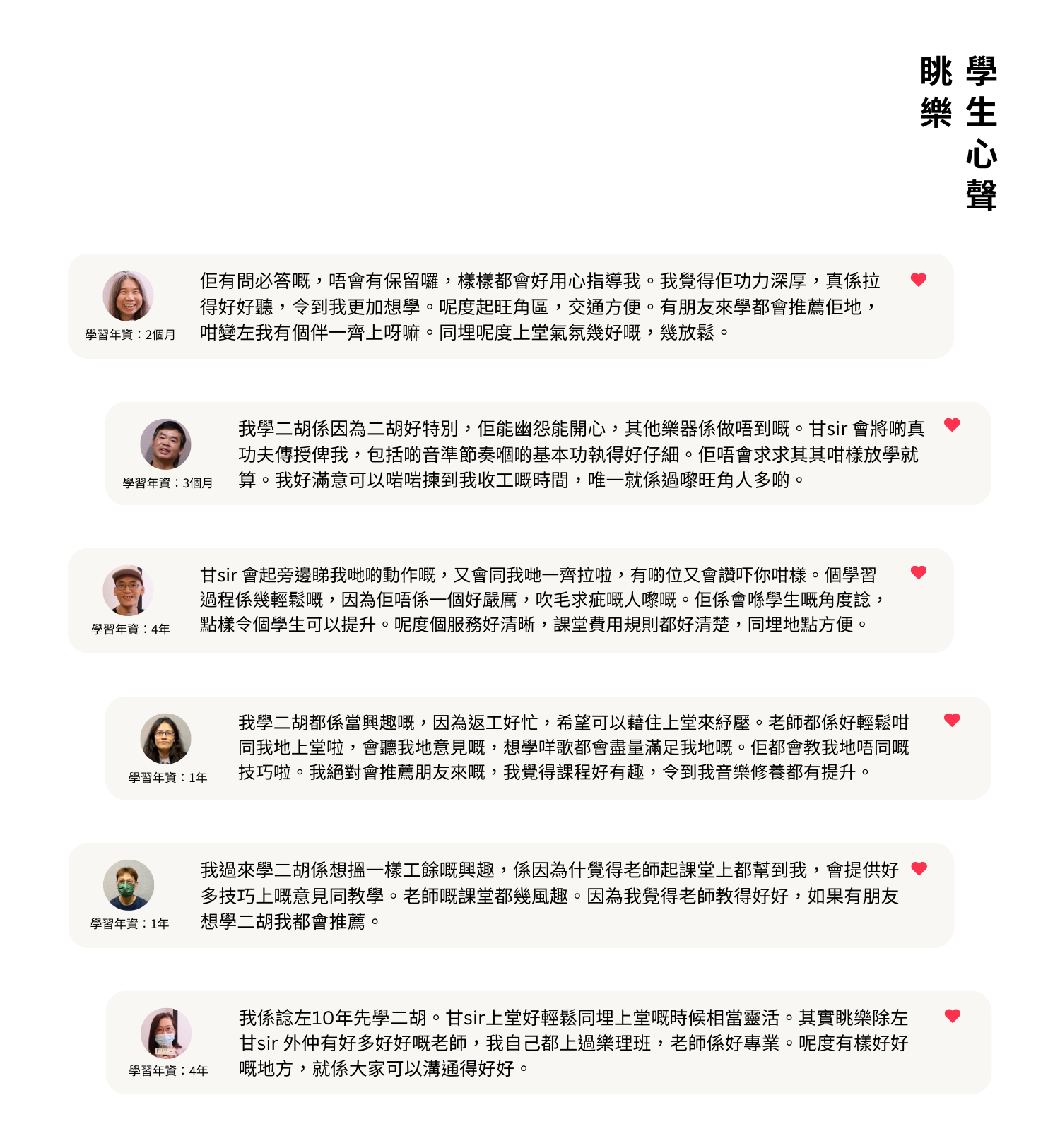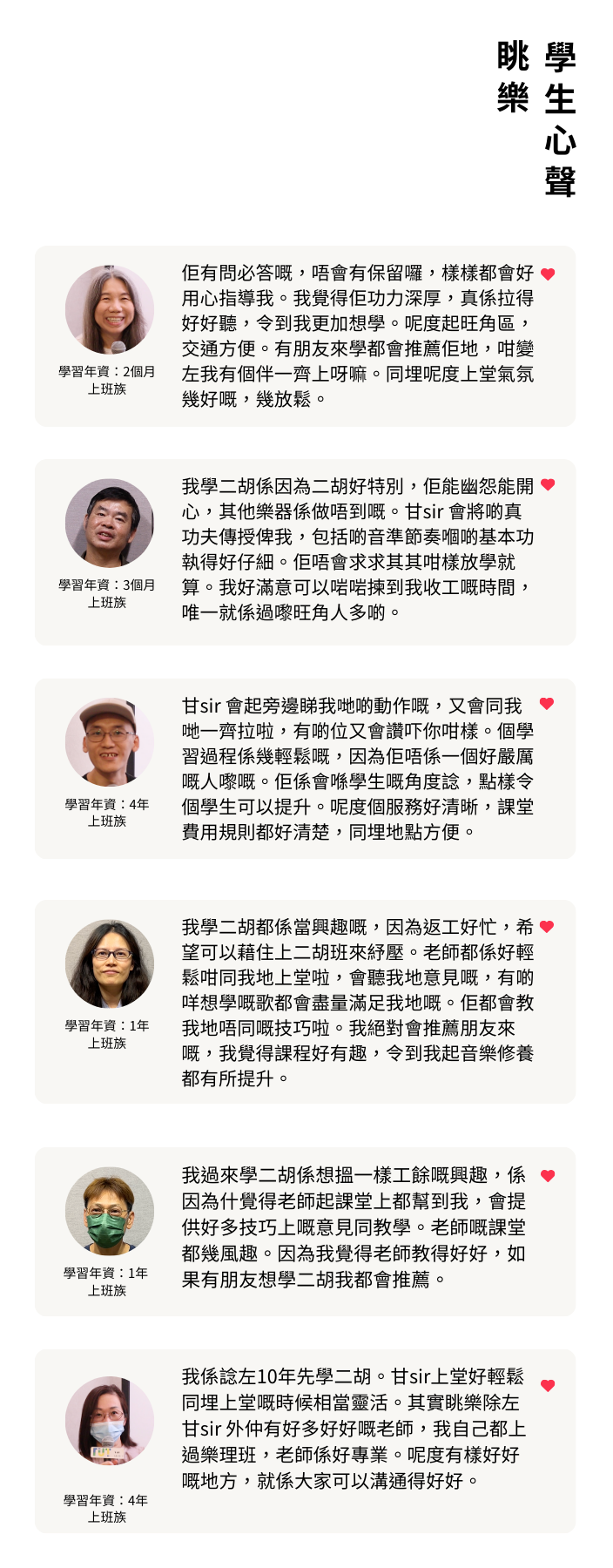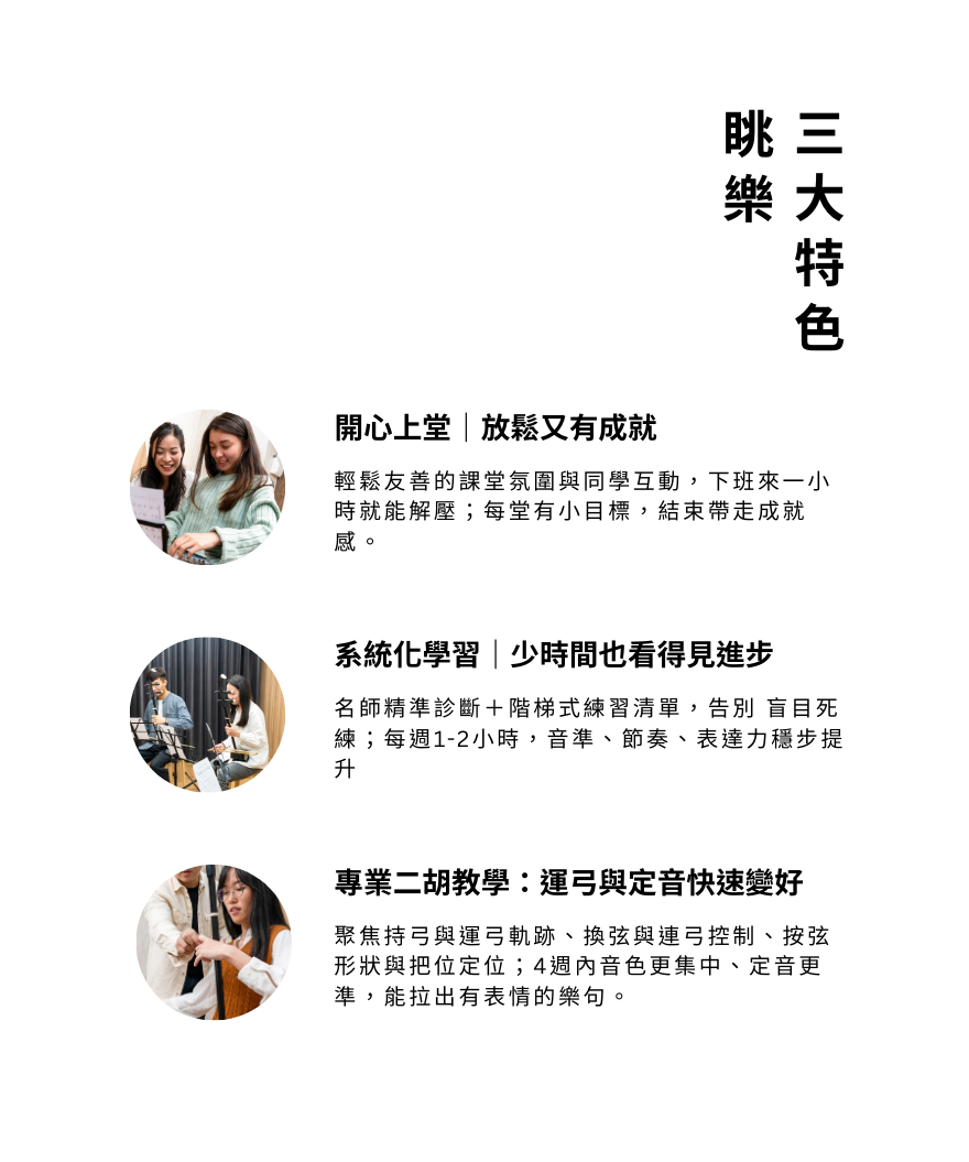 眺樂常規二胡課程針對希望系統學習、進一步提升技巧與音樂表現力的學生,課程涵蓋基礎到進階弓法、D/G調運指、音色控制、視譜能力與樂曲詮釋,並可銜接考級、比賽與錄影計劃。